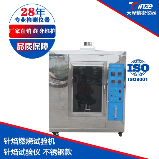 针焰试验仪是用规定尺寸(Φ0.9mm )的针状燃烧器,通以特定燃气(丁烷),以 45°角定时定向施燃试品,视试品是否引燃及持燃时间和燃烧长度来评定设备内部因故障条件造成的小火焰的着火危险性。